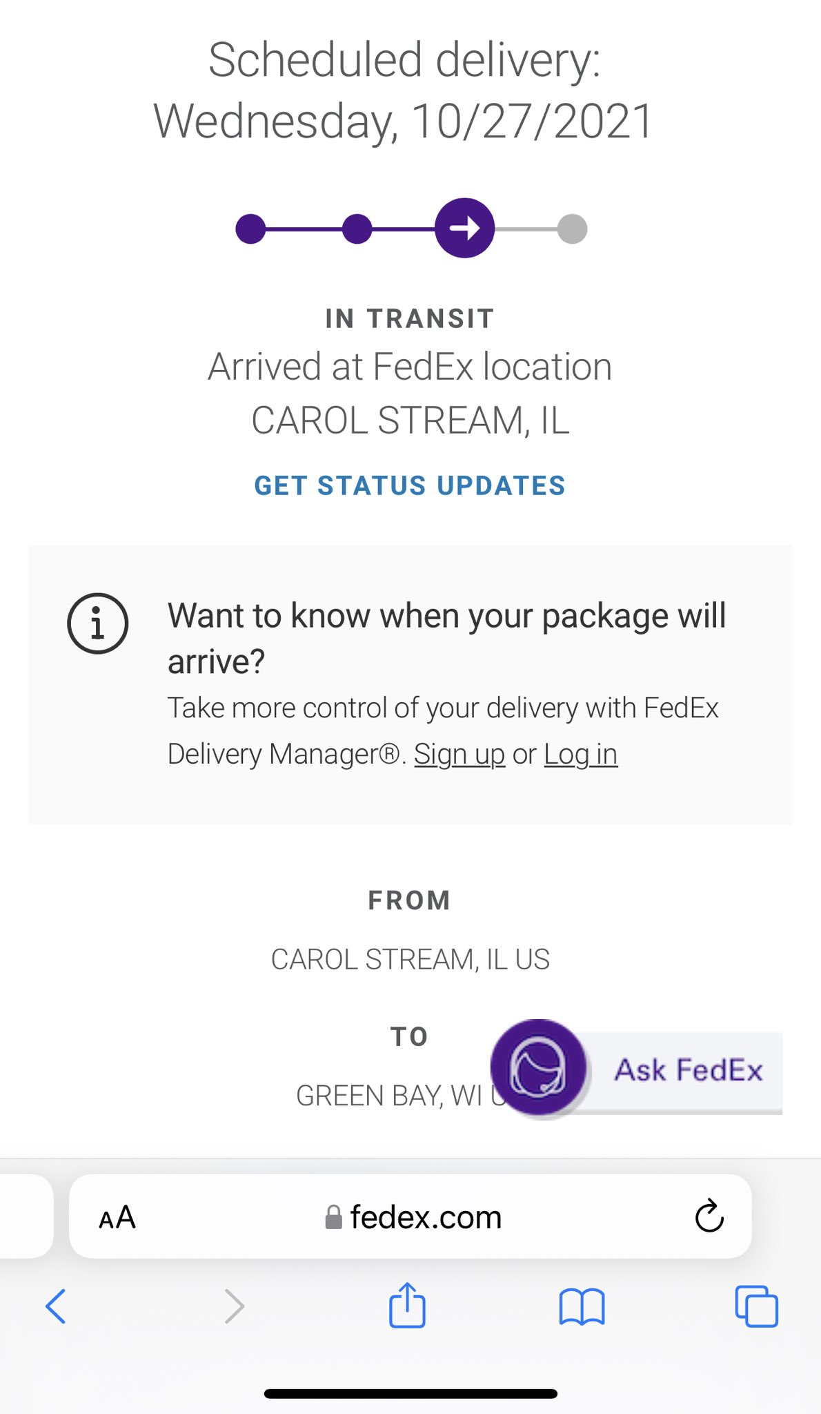 Our Carol Stream Illinois facility provides access to 84 of the US. Mine still says arrived at FedEx location in Carol Stream IL yesterday at 3pm. Day of the Week.